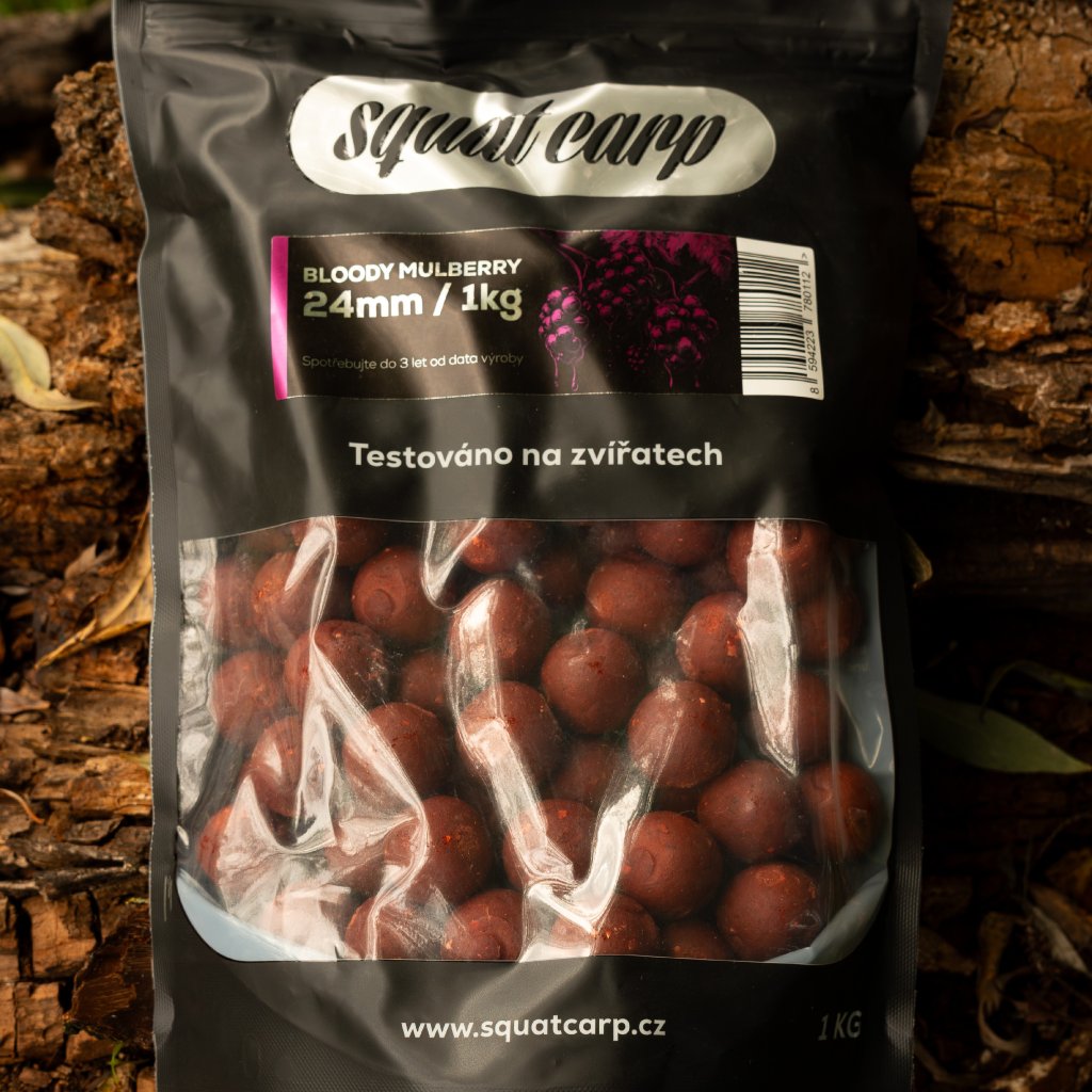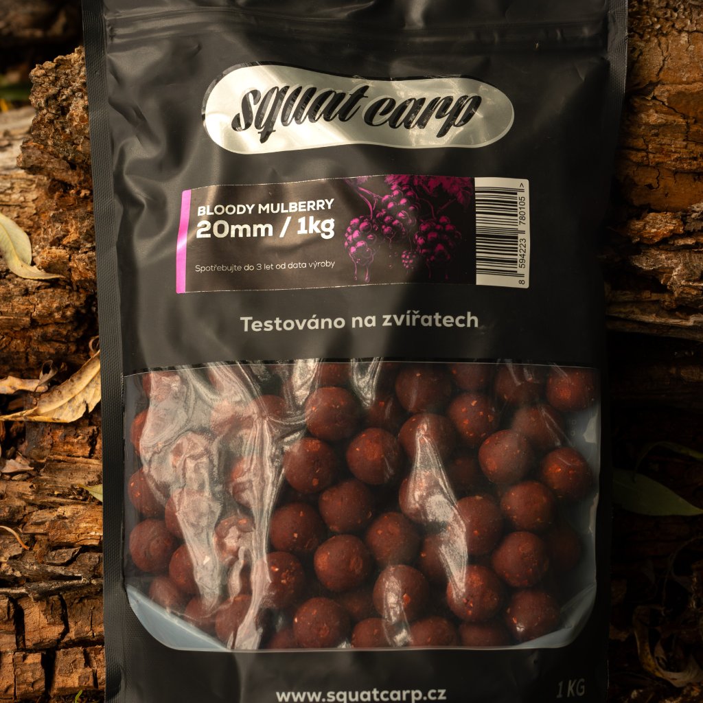 BLOODY MULBERRY je univerzální boilies, které exceluje při krátkých vycházkách, závodech i delších kampaních. Skvěle pracuje v teplé i studené vodě a patří mezi nejspolehlivější sladké nástrahy v sortimentu Squat Carp.