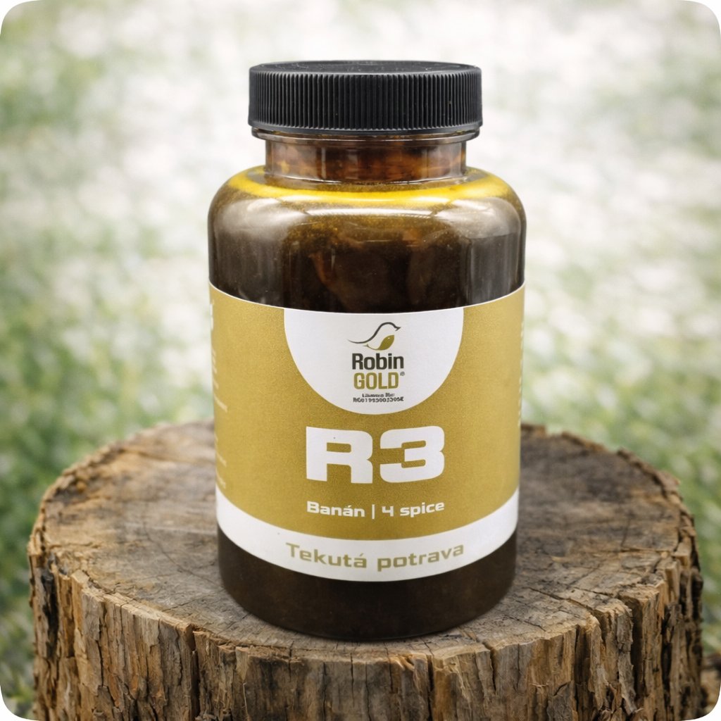 A Baits - Tekutá potrava R3 Banán 4 druhy koření 300ml Dobrá rozpustnost a dlouhotrvající účinek 🎣