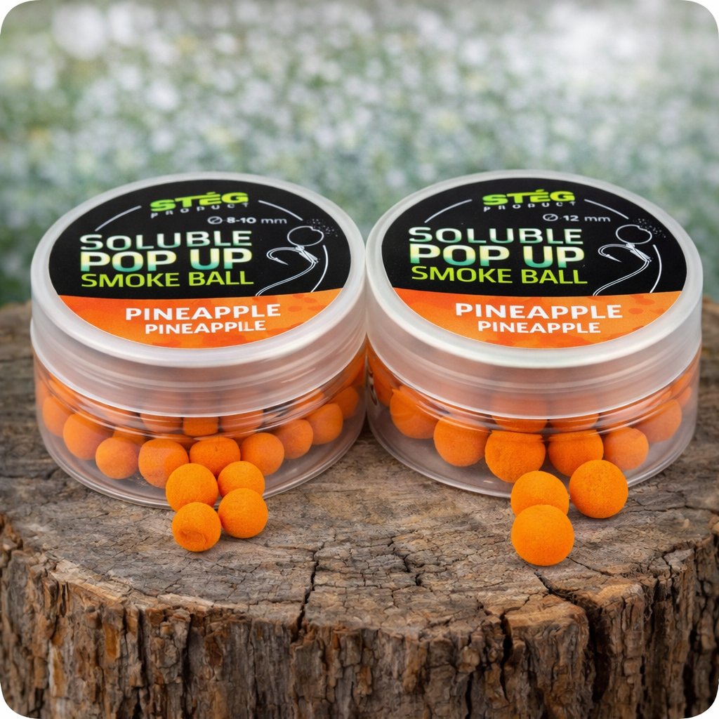 Soluble Pop Up Pineapple patří mezi nejefektivnější sladké signální nástrahy na kapry i amury. Po dopadu do vody okamžitě začíná uvolňovat intenzivní ananasové aroma a typický žlutý „smoke ball“ efekt, který dokáže přivolat záběr i na silně prochytávaných lokalitách v Česku i na Slovensku.